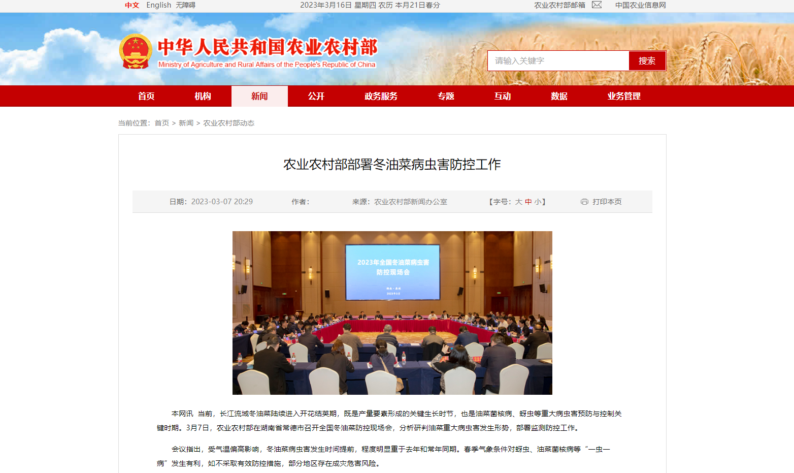 • 农业农村部部署冬油菜病虫害防控工作 2023-03-16