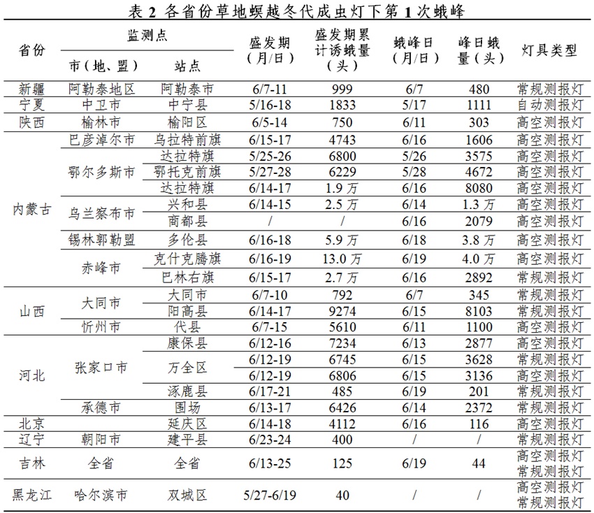 5月中下旬宁夏、内蒙古西部,6月上中旬内蒙古、河北、山西、北京、陕西、新疆等西北华北地区出现灯下蛾峰。其中,内蒙古、河北、山西等地14个监测点出现单灯单日千头以上蛾峰,内蒙古达拉特旗、山西阳高达8000头,内蒙古兴和、多伦、克什克腾旗达1万—4万头(详见表2)。