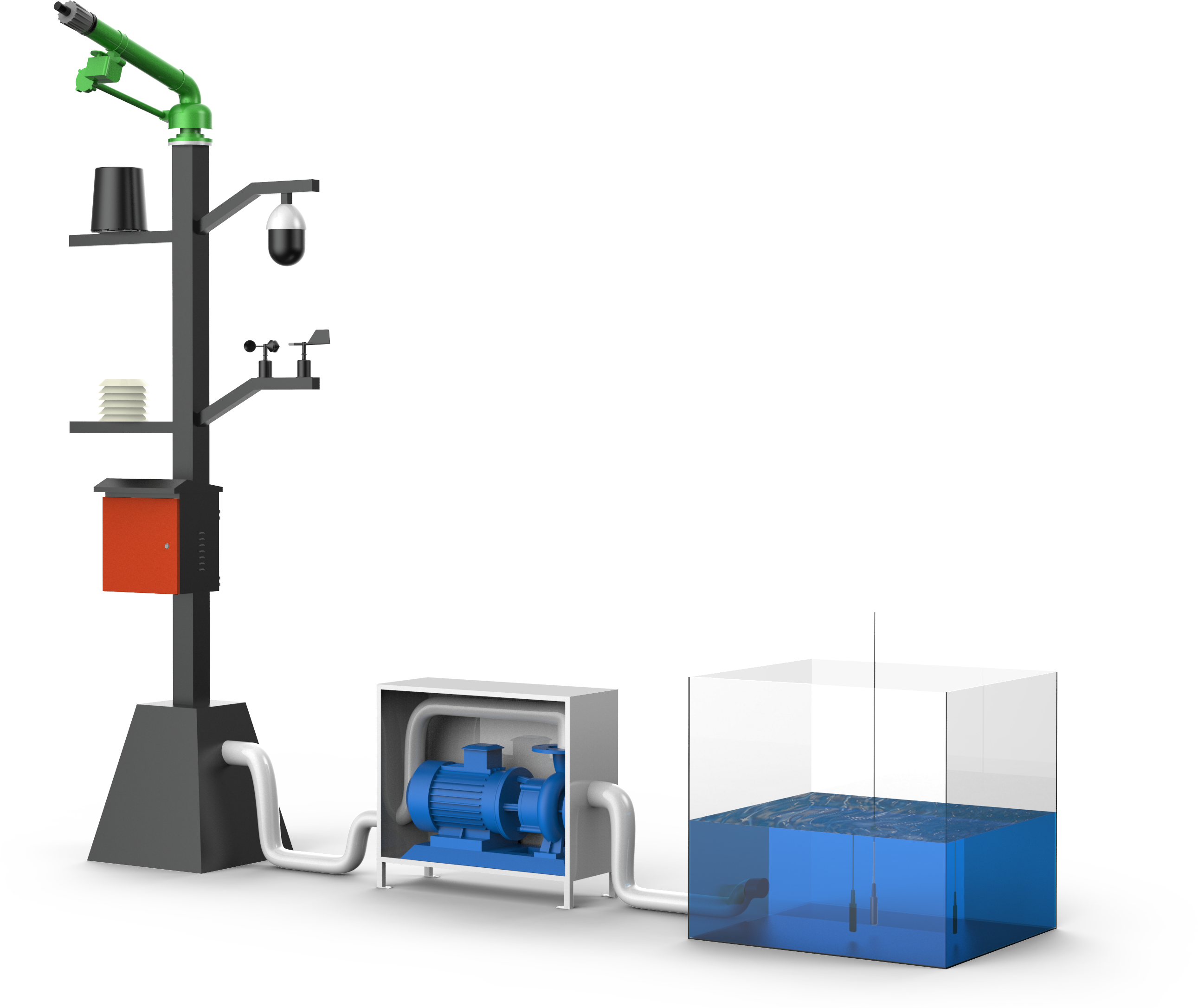 新型智能喷灌塔是由高压供水主机、防锈立杆、旋转喷头(喷头可360°旋转),触摸屏人机交互系统等组成。它是一款主要正对于大田、园林的喷灌产品。该装置在水泵动力源驱动下将水加压至2-6公斤高压,通过智能变频控制,喷灌半径可设置为0-50米左右,覆盖面积0-10亩。